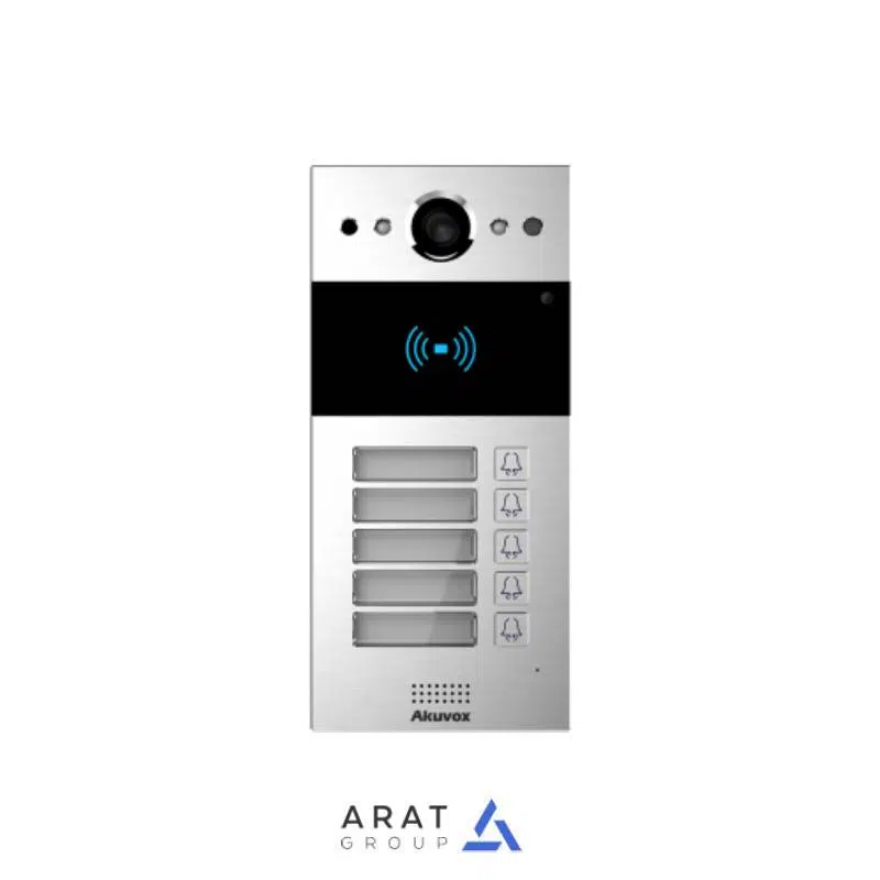 ایفون 5 زنگ آکووکس مدل R20B-5 یک اینترکام هوشمند با قابلیت پشتیبانی ومدیریت 5 واحد و 2 رله (2درب) می باشد. R20B-5 دارای یک بدنه مقاوم از جنس آلومینیوم می باشد که آن را در برابر خرابکاری، ضربه و ایجاد خط و خش محفوظ می نماید. این اینترکام هوشمند را می توان به کنترلر مرکزی خانه هوشمند Zipatile، پنل های تصویری خانه هوشمند (با قابلیت پشتیبانی از پروتکل SIP)، مانیتورهای هوشمند Akuvox و تلفن هوشمند (SIP Phone) متصل نمود.