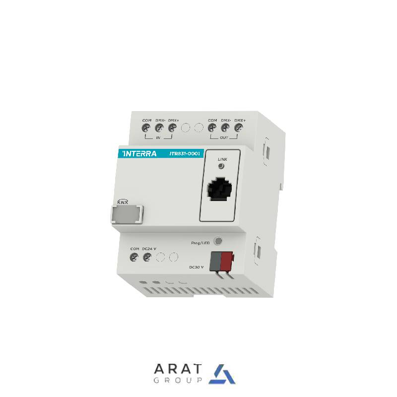 ITR831-0001 – Interra KNX – DMX Gateway از کنترل دو طرفه پشتیبانی می کند و می تواند برنامه های DMX را ضبط، پخش و حذف کند. با زمان ضبط حداکثر 4 ساعت، Interra KNX – DMX Gateway می تواند به طور گسترده ای برای کنترل دستگاه هایی با پورت پروتکل DMX داخلی برای کنترل رنگ LED، مانند نور کامپیوتر، نور هد متحرک، نور لیزر و غیره استفاده شود.