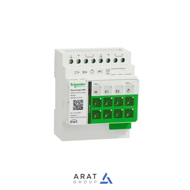 دیمر هوشمند اشنایدر مستر 2 کانال مدل MTN6710-0102 یک واحد کنترلی پیشرفته است که برای کنترل منابع روشنایی با قابلیت تنظیم شدت نور در دو کانال مستقل مورد استفاده قرار می‌گیرد. این دیمر دارای دو کانال است که هر کانال با قابلیت کنترل جداگانه قدرت منبع روشنایی را داراست.