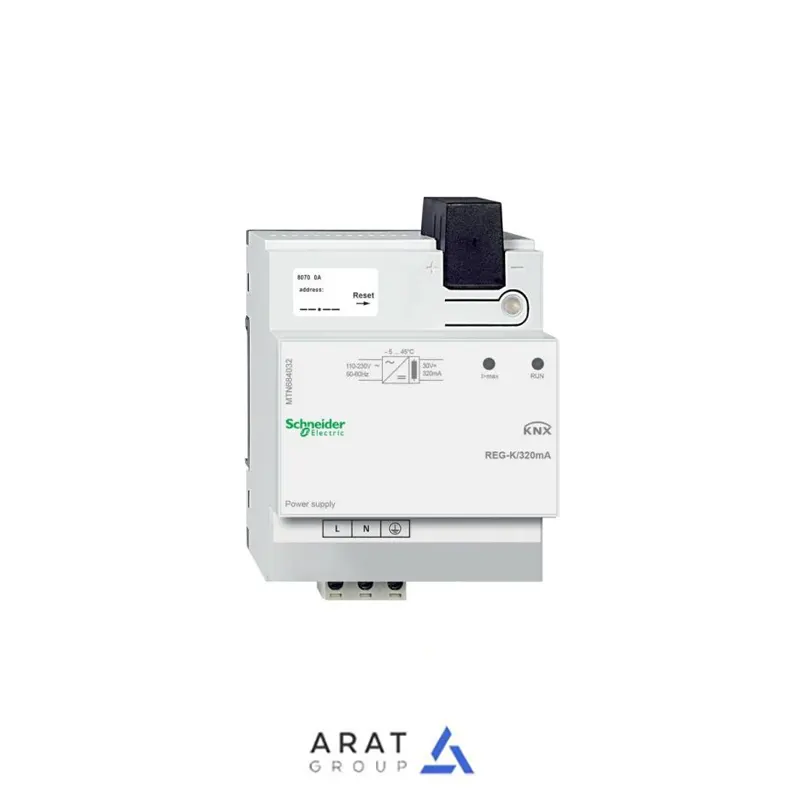 MTN684032 منبع تغذیه SpaceLogic KNX ولتاژ بسیار پایین ایمنی (SELV) یا سلو را برای تامین برق دستگاههای دارای باس KNX فراهم میکند. منبع تغذیه دارای دو خروجی داخلی متصل است- یک خروجی KNX با چوک یکپارچه و یک خروجی ۳۰ ولت DC برای دستگاههای اضافی. دو واحد منبع تغذیه یکسان را میتوان به صورت موازی متصل کرد.